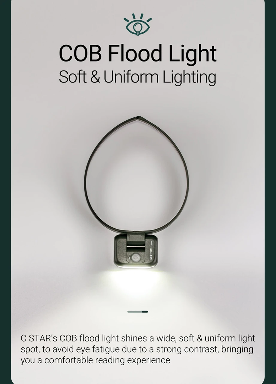 As a neck light, it shines a dazzle-free light below the eyes for reading or any other close up work. You can now move freely without worrying about dazzling others. The C STAR can also work as a pressure-free headlamp with a 180° rotary light head.
